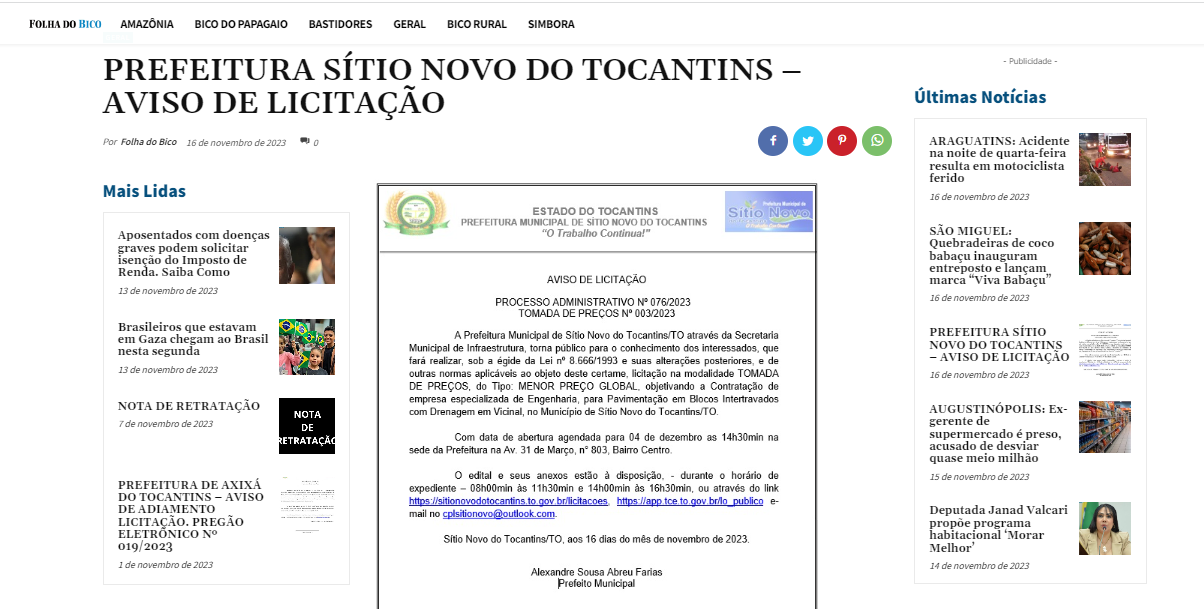 Contratação de empresa especializada de Engenharia, para Pavimentação em Blocos Intertravados com Drenagem em Vicinal, no Município de Sítio Novo do Tocantins/TO.